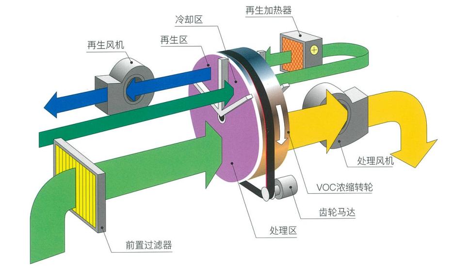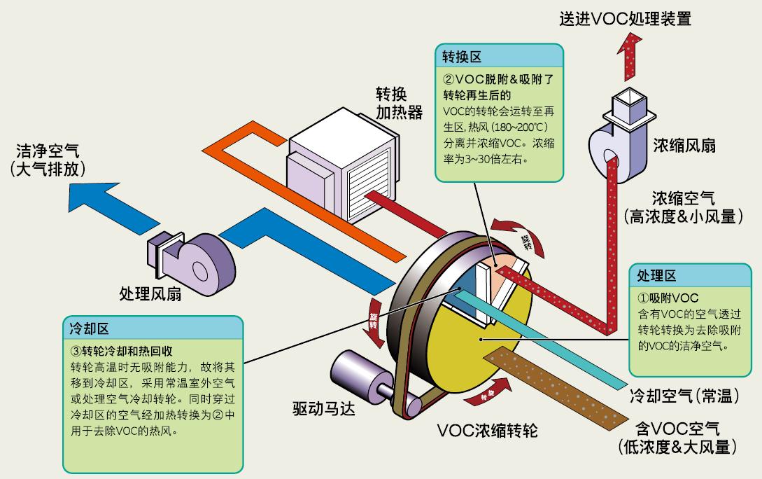 目前国内外对VOC的末端治理方法有:冷凝、吸附、氧化、生物处理、吸收、等离子体净化等。以沸石材料为载体的吸附浓缩法处理VOC废气(沸石转轮)得到了较为广泛的应用。全国对VOCs污染物防治的要求和力度逐渐加强,低浓度废气治理的沸石转轮吸附浓缩法成为了很多企业的优选治理方案。